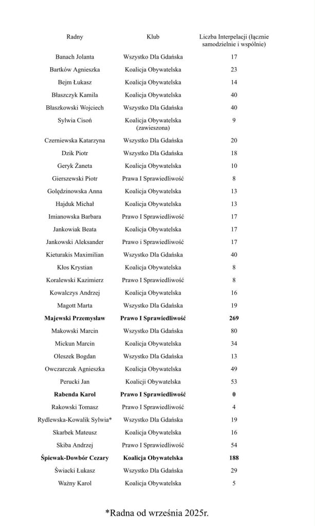 Z kolei najmniej aktywnym pod kątem interpelacji radnym okazał się doradca prezydenta RP Karol Rabenda. Radny Prawa i Sprawiedliwości nie złożył ani jednej interpelacji.