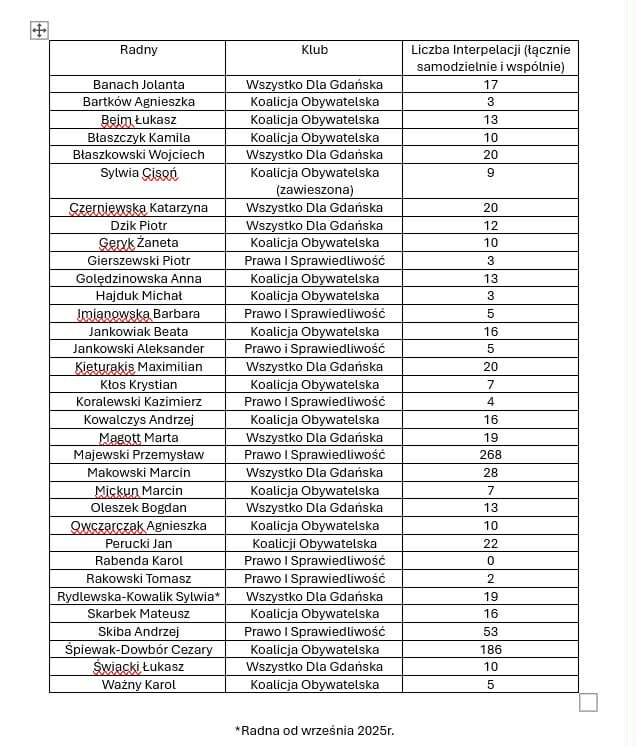 Tabela liczbowa interpelacji w Radzie Miasta Gdańska. Stan na 18 grudnia, przed ostatnią sesją w 2025 roku (graf. mat. pras.)