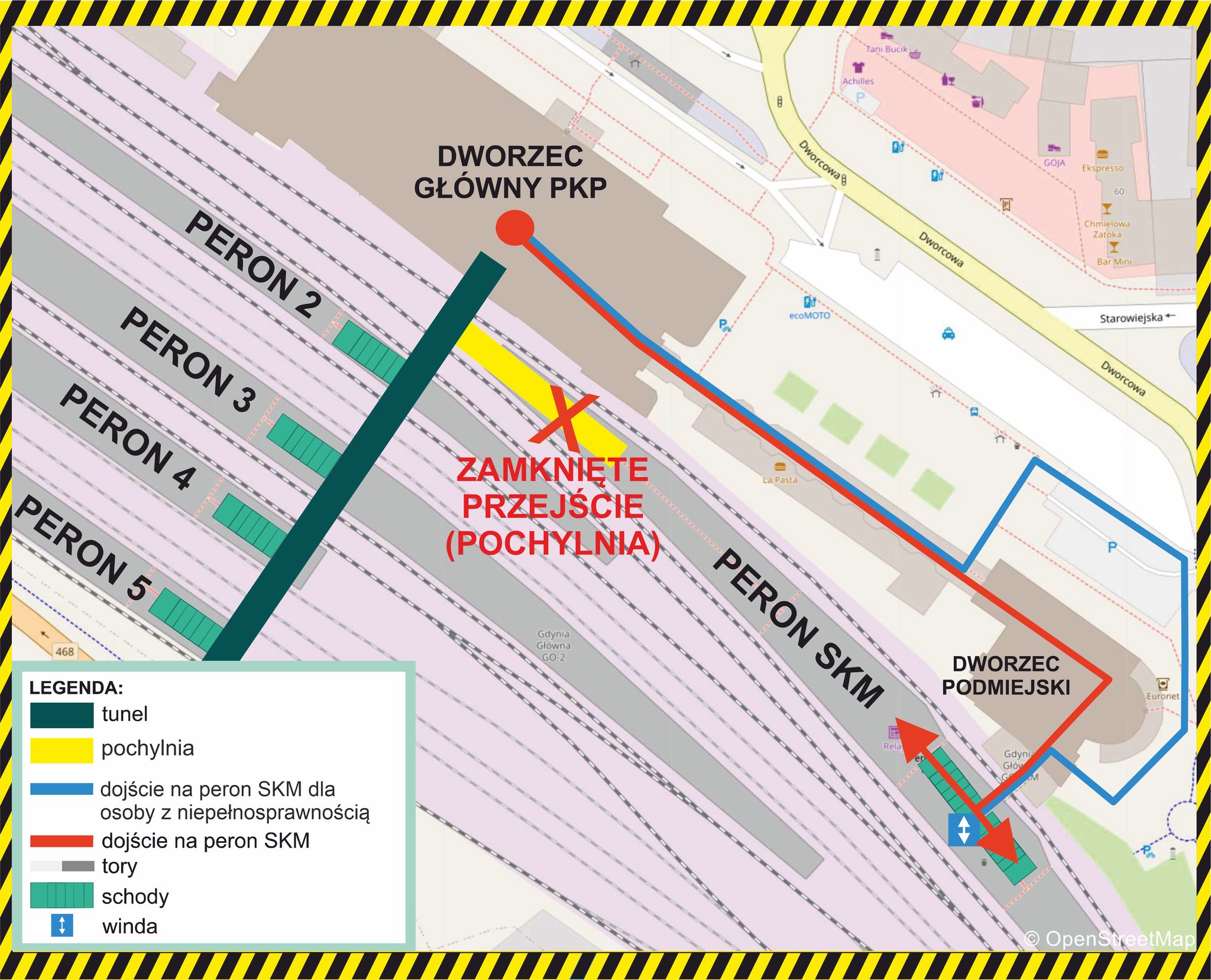 Od czwartku, 25 marca, do odwołania wyłączona z użytkowania będzie pochylnia prowadząca na peron SKM na stacji Gdynia Główna od strony tunelu dworca PKP. Wynika to z konieczności przeprowadzenia prac budowlanych obejmujących m.in. przebudowę nawierzchni oraz korektę kąta nachylenia pochylni.