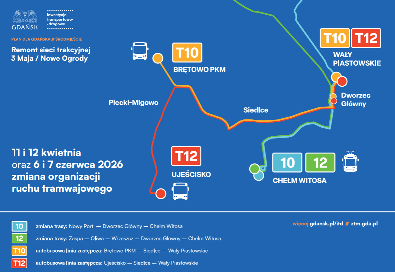 – 27 czerwca oraz 11 i 12 kwietnia to etap, kiedy wprowadzimy tutaj komunikację zastępczą. Dwa autobusy – T10 i T12 – będą kursowały zamiast tramwajów – „dziesiątki” i „dwunastki” – w kierunku Siedlec. Kluczowym elementem remontu jest czas, w którym będziemy musieli zamknąć przystanki na ul. Powstańców Warszawskich, Hucisku oraz przy węźle Groddecka w kierunku urzędu miejskiego – dodaje Łukasz Kłos, dyrektor Zarządu Transportu Miejskiego w Gdańsku.