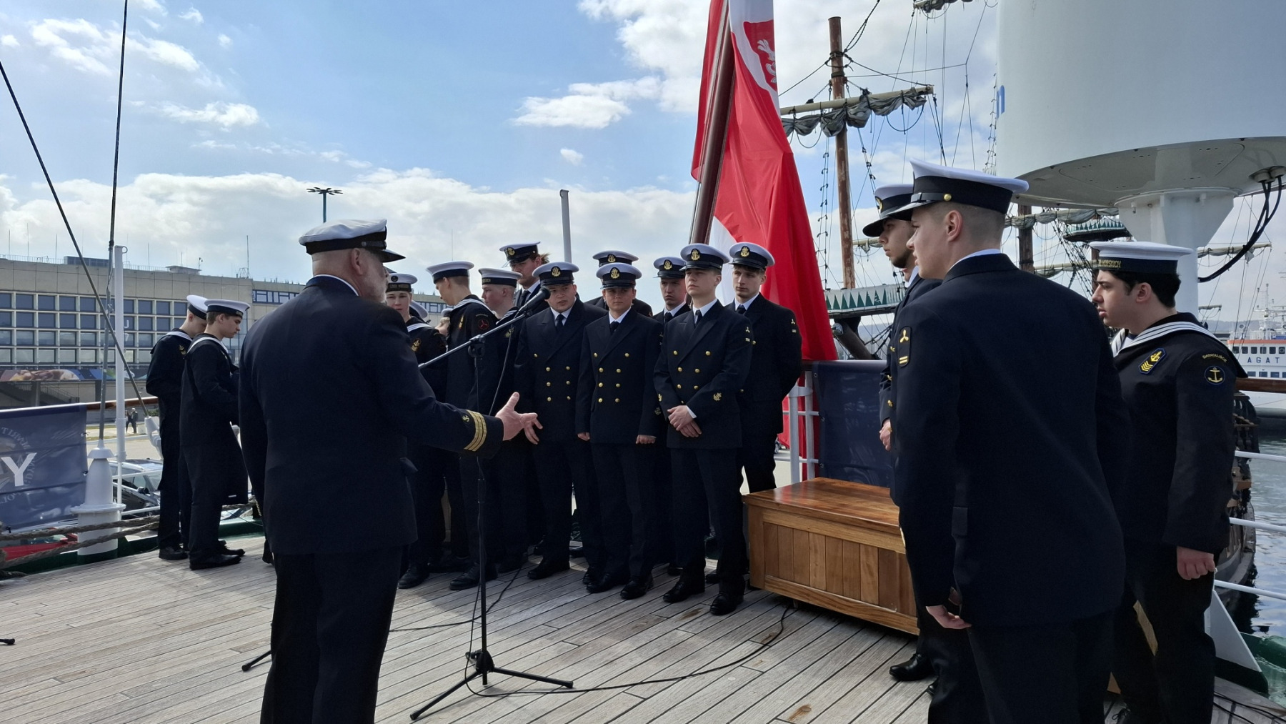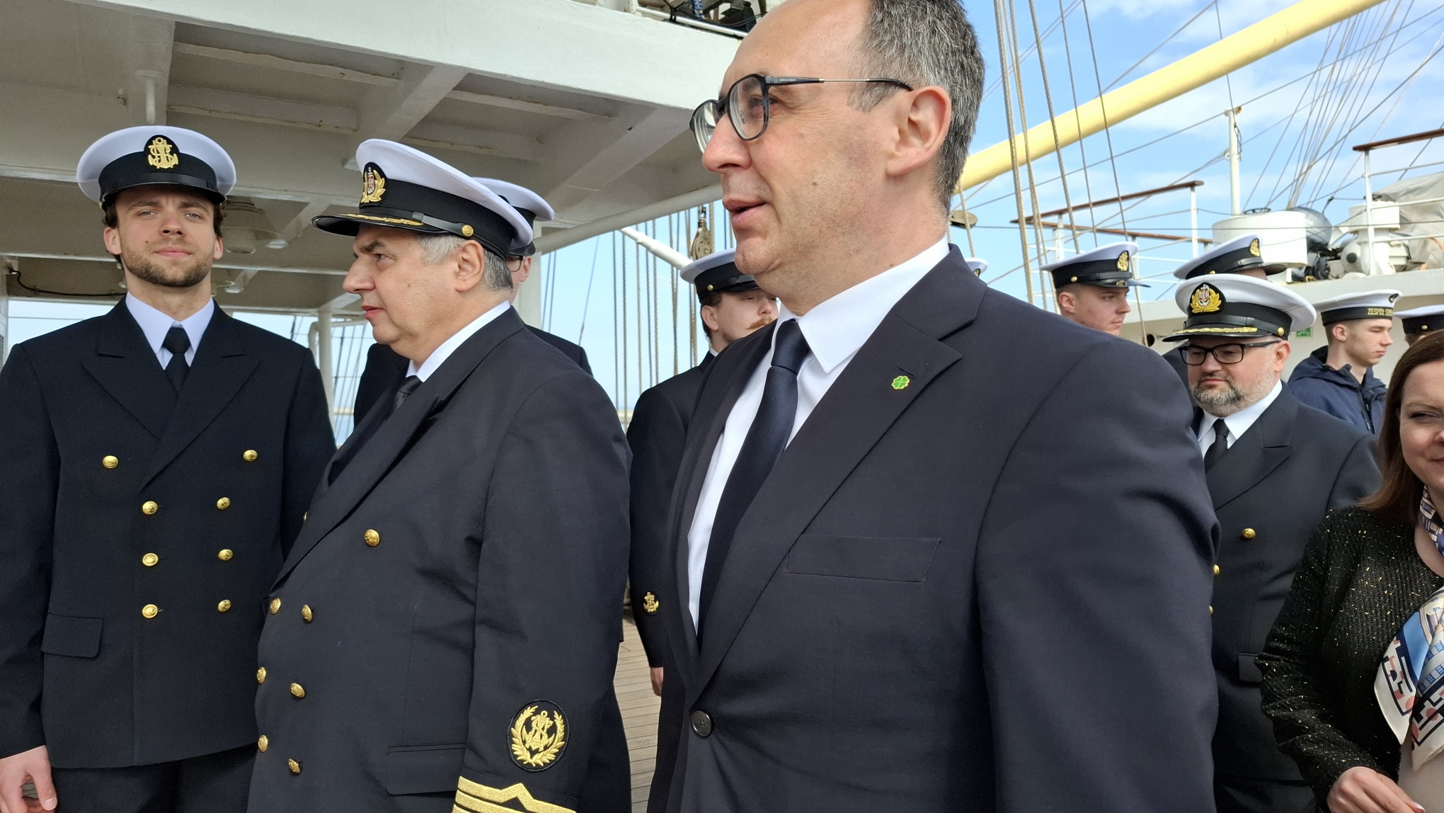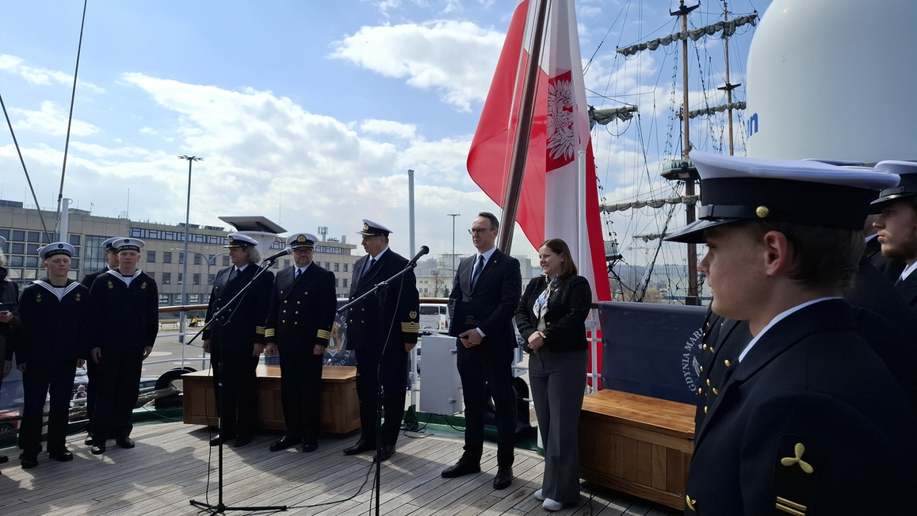 Minister Dariusz Klimczak w wystąpieniu w sposób szczególny odniósł się do znaczenia rejsu w kontekście rozwoju kompetencji przyszłych kadr gospodarki morskiej oraz promocji polskiego szkolnictwa morskiego w świecie, przypomniał również o trwającym konkursie na nazwę dla następcy Daru Młodzieży.
