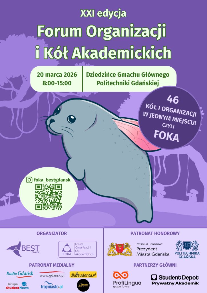 Forum Organizacji i Kół Akademickich, w skrócie FOKA, to wyjątkowe wydarzenie promujące działalność kół naukowych oraz organizacji studenckich działających na Politechnice Gdańskiej. Jego celem jest przybliżenie uczestnikom różnorodnych inicjatyw akademickich, które współtworzą życie studenckie na uczelni.