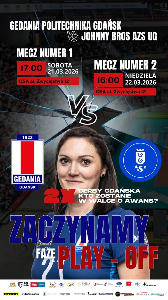 Gedania Politechnika Gdańsk podejmuje JohnnyBros AZS Uniwersytet Gdański w kolejnych meczach 2. Ligi Siatkówki Kobiet. Serdecznie zapraszamy kibiców na dwa mecze I rundy fazy play-off sezonu 2025/2026 w rozgrywkach 2. Ligi Siatkówki Kobiet. W sobotę, 21 marca o godzinie 17:00 oraz 22 marca o godzinie 16:00, drużyna Gedania Politechnika Gdańsk zmierzy się z JohnnyBros AZS Uniwersytet Gdański.