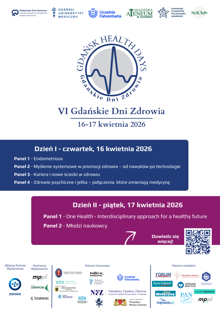 W dniach 16 – 17 kwietnia 2026 roku odbędzie się VI edycja Gdańskich Dni Zdrowia – wydarzenia poświęconego współczesnym wyzwaniom i kierunkom rozwoju w obszarze zdrowia publicznego, medycyny oraz zdrowia psychicznego. Tegoroczna edycja łączy spotkania stacjonarne na Gdańskim Uniwersytecie Medycznym z częścią online.